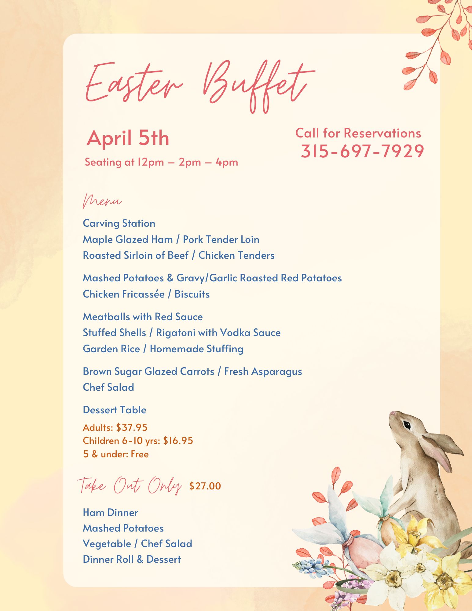 Accepting Reservations for Easter now! Contact us Easter Buffet April 5, 2026 Call (315) 697-7929 to make a reservation!