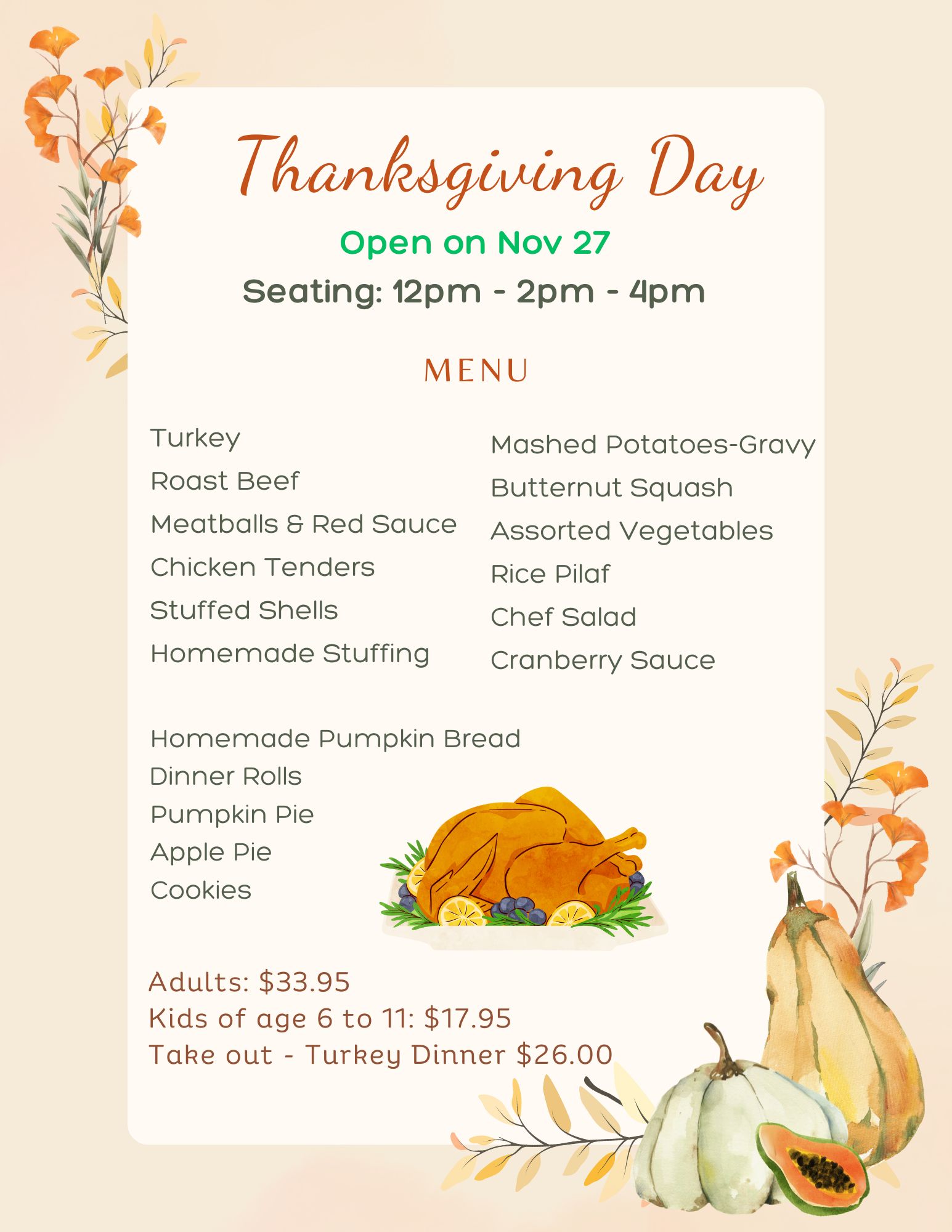 Thanksgiving Menu - Now Accepting Reservations Nov 27, 2025 Call (315) 697-7929 to make a reservation!